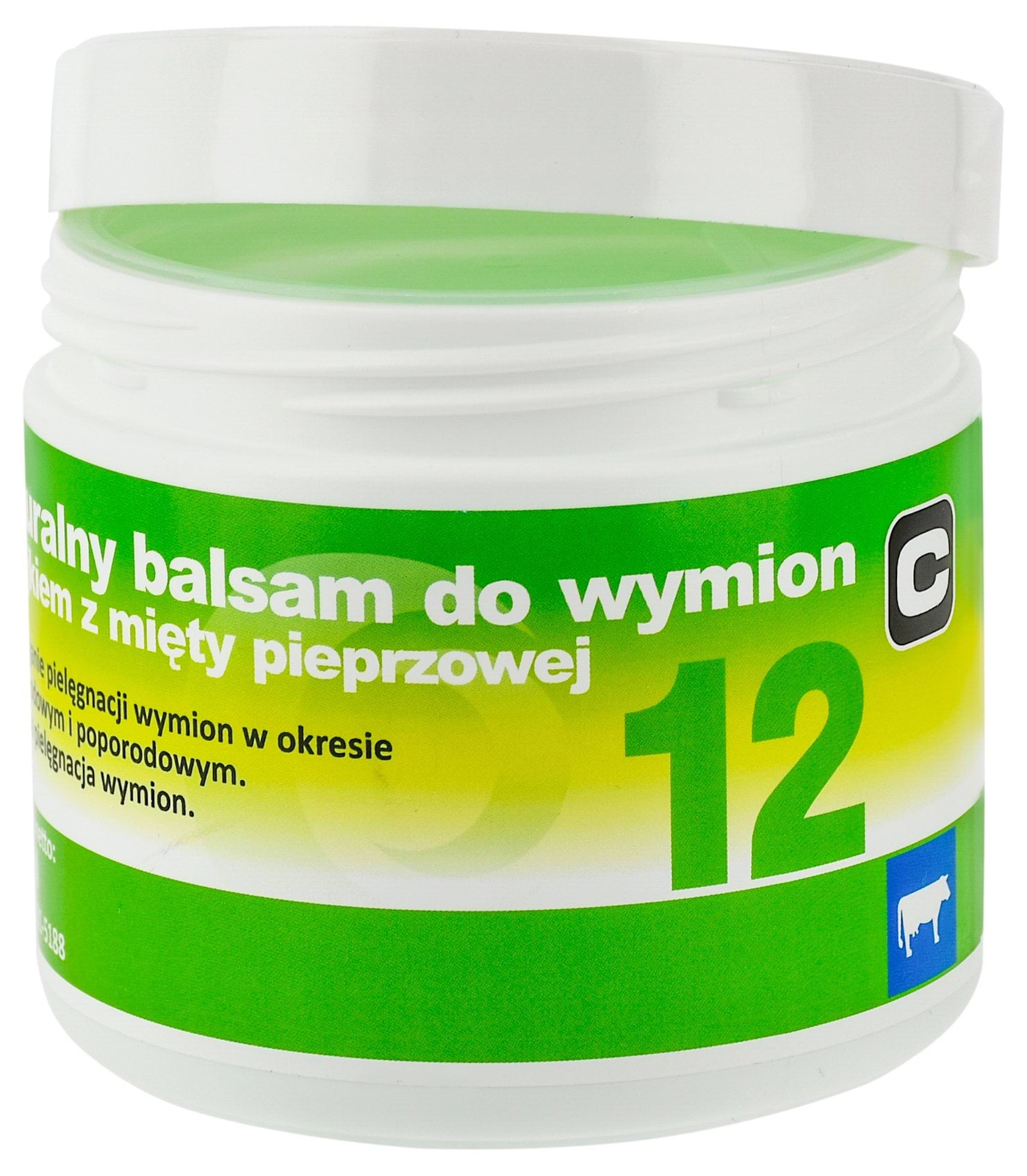 - Balsam do wymion z olejkiem z mięty „12”, opakowanie 500 ml. Skutecznie pielęgnuje i odświeża wymiona, zapewniając uczucie świeżości i komfortu. Doskonały do codziennej pielęgnacji bydła mlecznego.