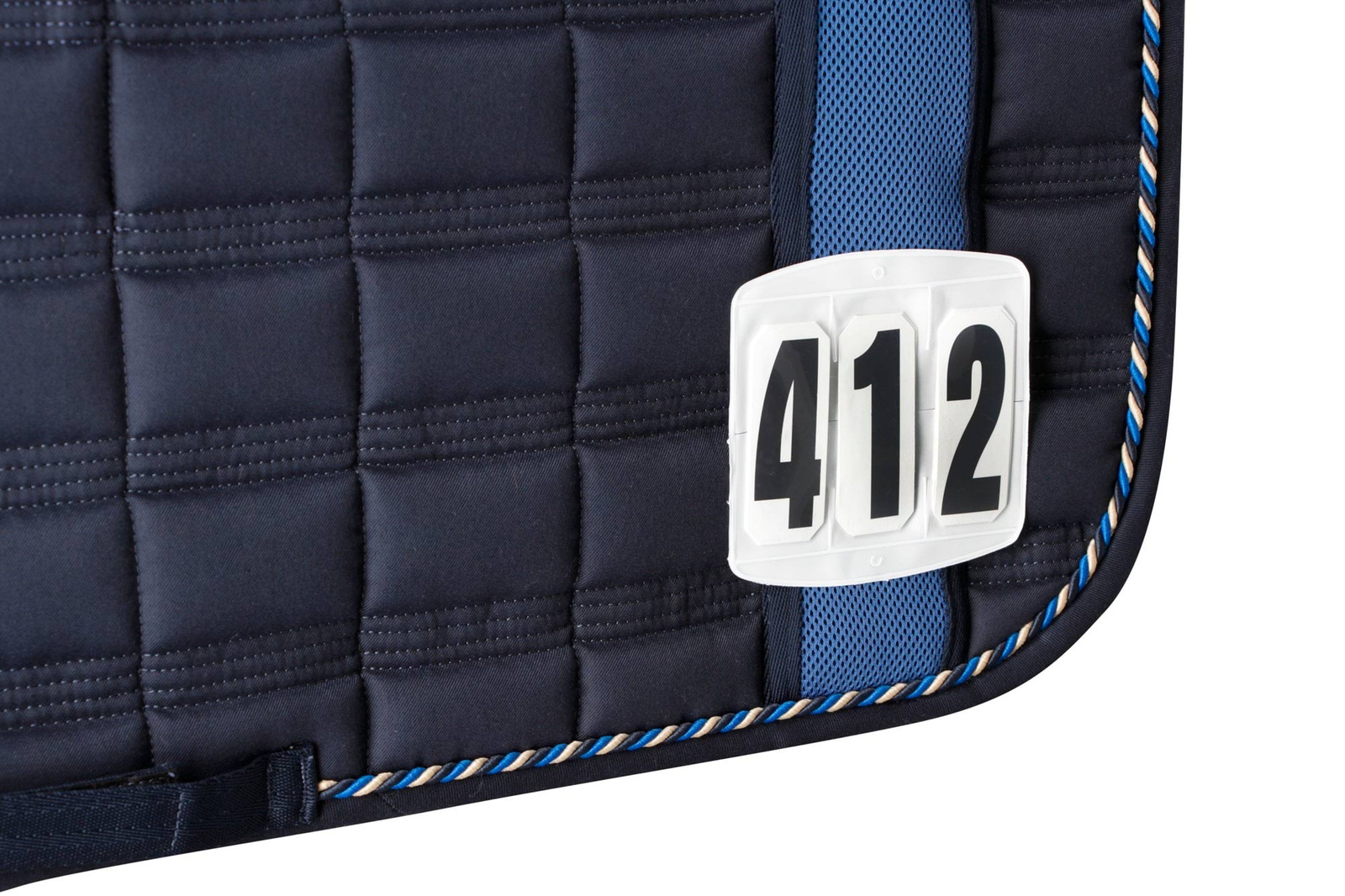 - Numer konkursowy Covalliero, 3-miejscowy, biało-czarny, mocowany na rzep – lekki, trwały i łatwy w użyciu podczas zawodów jeździeckich.