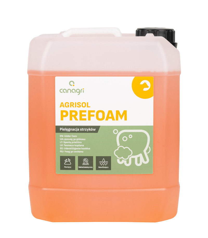- Agrisol PreFoam 70, 20 kg, Can Agri – pianowy płyn do mycia wymion, skutecznie usuwa zanieczyszczenia, zapewniając doskonałą higienę przed dojeniem.