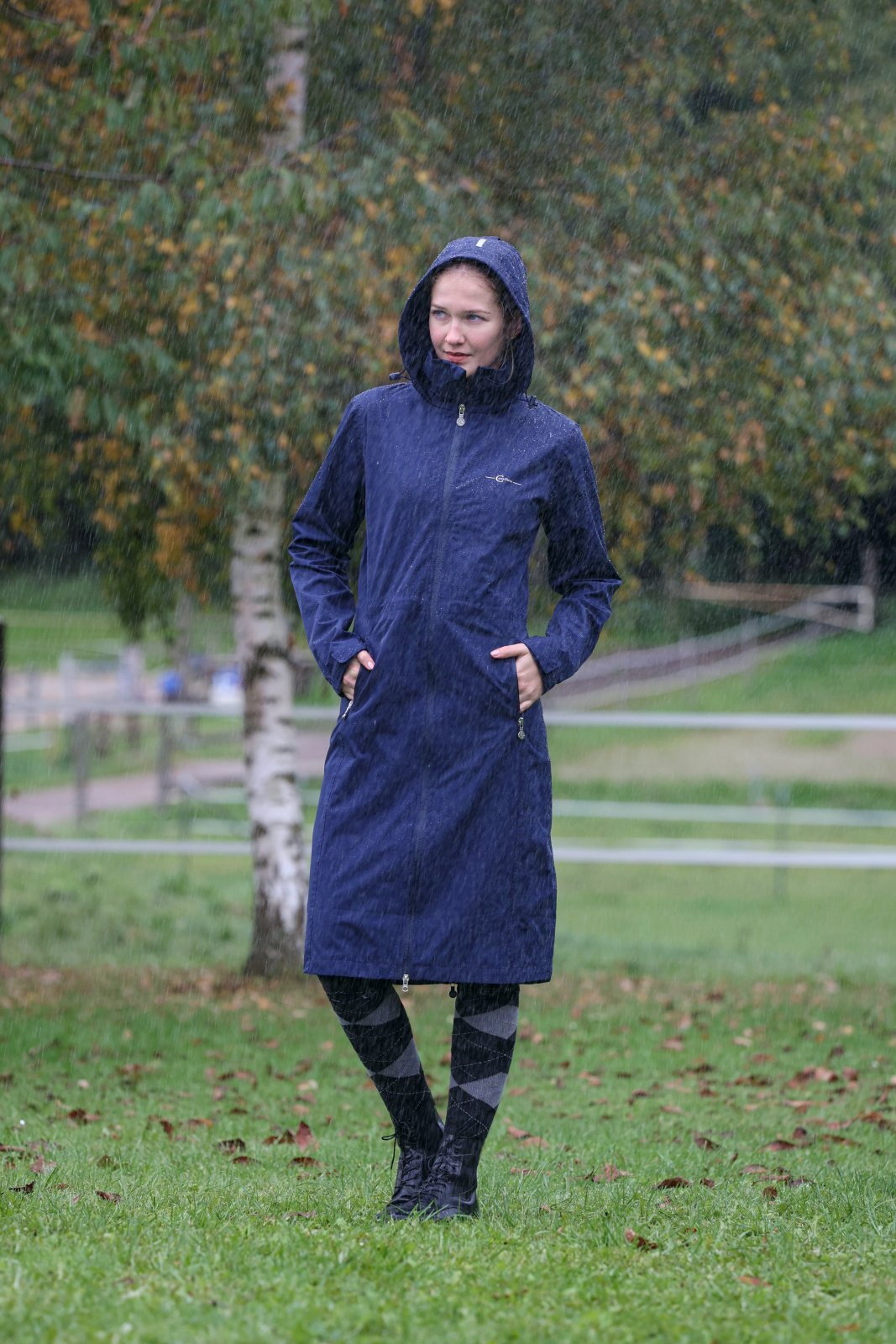 - Damski płaszcz jeździecki przeciwdeszczowy Covalliero, granatowy, rozmiar XXS. Wodoodporny, lekki i oddychający, zapewnia skuteczną ochronę przed deszczem. Ergonomiczny krój gwarantuje wygodę i swobodę ruchów, idealny do jazdy konnej.