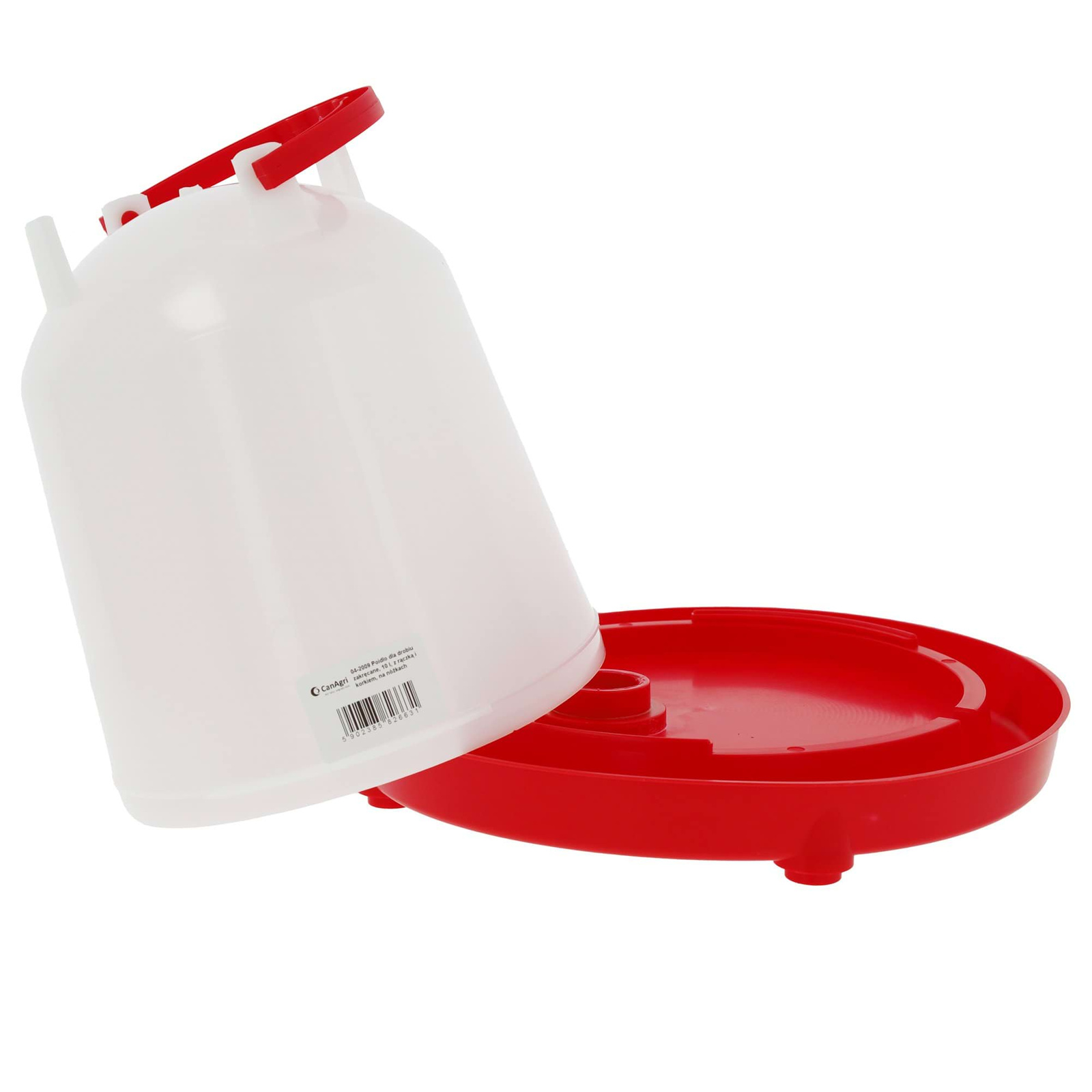- Poidło dla drobiu zakręcane, 10 l, z rączką i korkiem, na nóżkach. Praktyczne i stabilne, zapewnia ptakom stały dostęp do świeżej wody i łatwe dozowanie.
