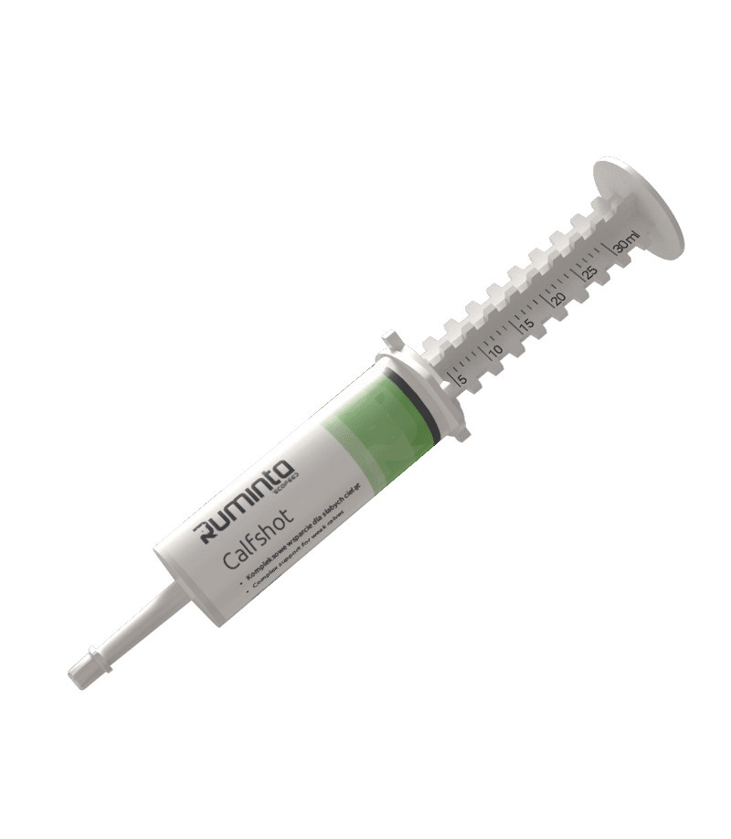 - Ruminta Calfshot 30 ml to preparat wspomagający cielęta w przypadku biegunek. Uzupełnia elektrolity, wspiera regenerację i odporność, pomagając szybciej wrócić do pełnej siły.