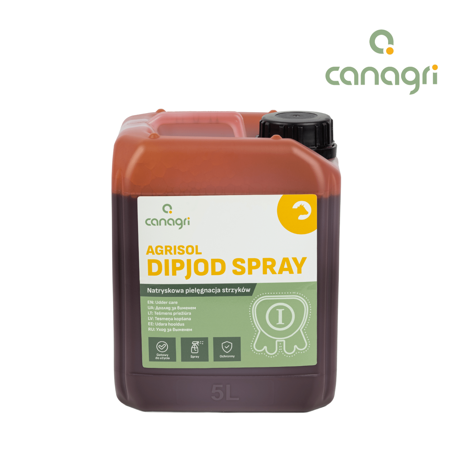 - Agrisol DipJod Spray 79, 5 kg, Canagri – gotowy do użycia preparat do dipingu strzyków na bazie jodu. Tworzy trwałą warstwę ochronną, zapobiega skapywaniu i pielęgnuje skórę. Idealny do aplikacji natryskowej w robotach udojowych i zraszaczach.