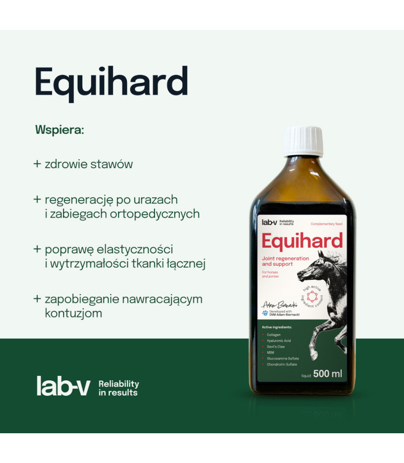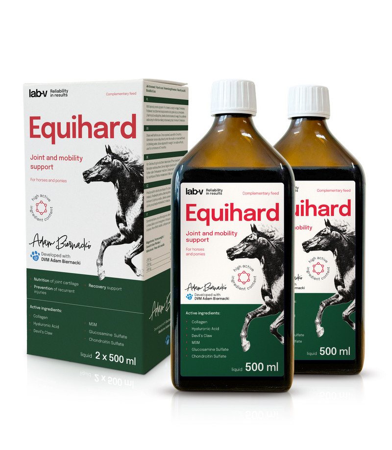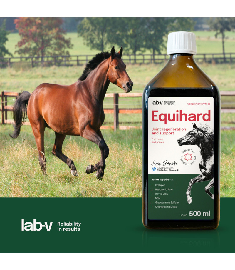 - Preparat na stawy dla koni i kucyków LAB-V Equihard, 1000 ml. Wspiera zdrowie stawów, poprawia mobilność i elastyczność, idealny do codziennej suplementacji zwierząt aktywnych i pracujących.