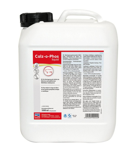 - Calz-o-Phos 5000 ml – płynny preparat dla krów uzupełniający wapń i fosfor. Zawiera 59 g Ca i 45 g P/500 ml. Bez chlorku wapnia, bezpieczny dla błon śluzowych. Pomaga zapobiegać gorączce mlecznej i hipokalcemii.