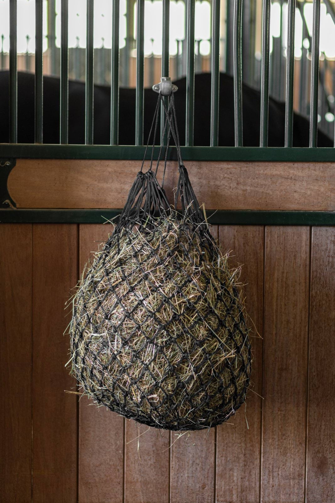 - Siatka na siano Covalliero Nova, czarna – bez pierścieni, oczko 5 cm. Spowalnia jedzenie, sprzyja zdrowemu trawieniu i zmniejsza straty paszy.