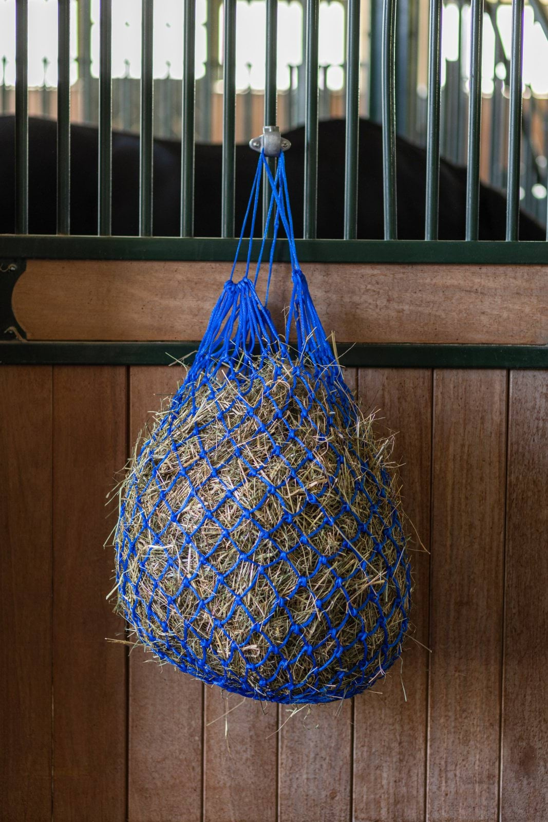 - Siatka na siano Covalliero Nova, niebieska – bez pierścieni, oczko 5 cm. Spowalnia pobieranie paszy, wspomaga trawienie i ogranicza marnowanie siana.
