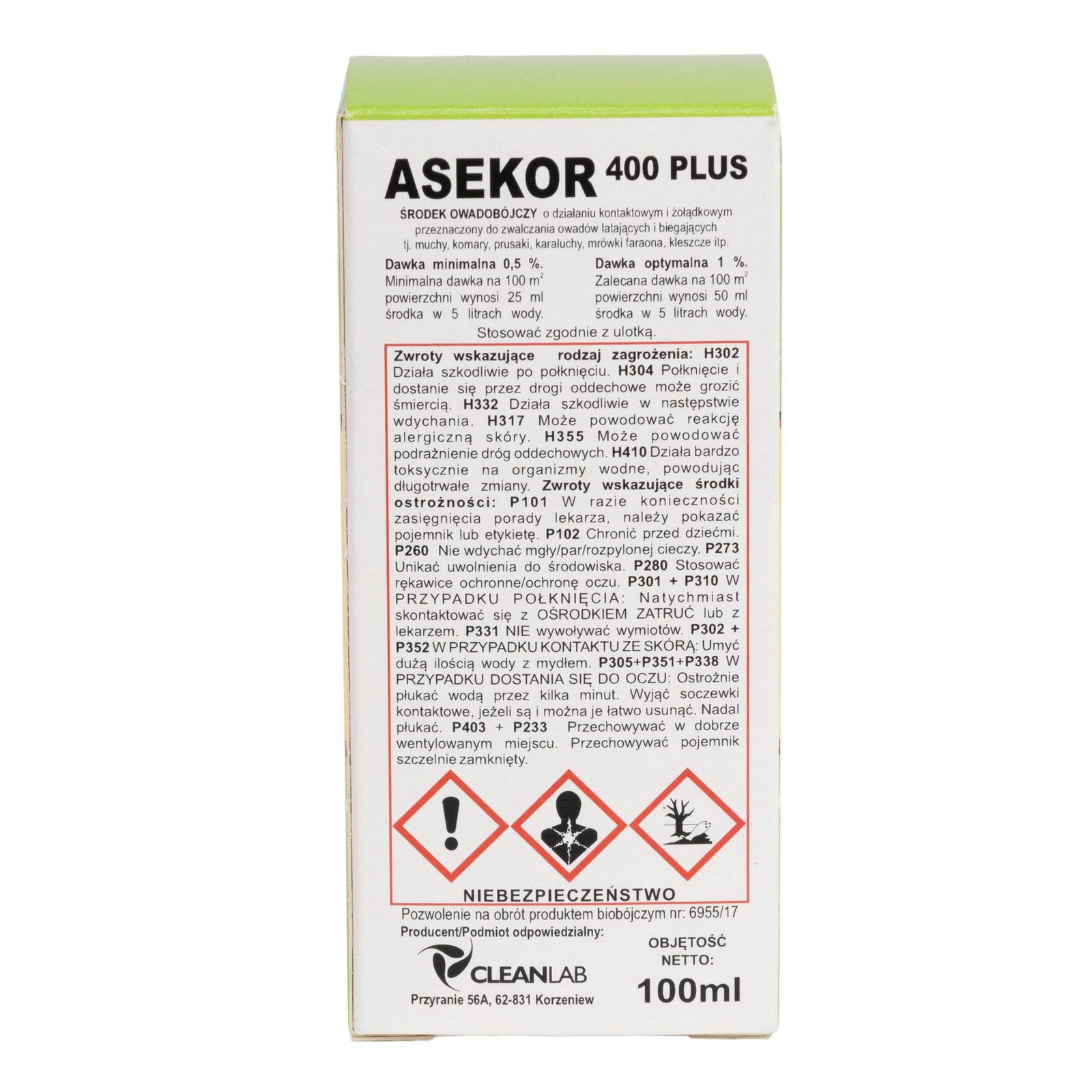 - Środek owadobójczy ASEKOR 400 Plus, 100 ml. Skutecznie zwalcza owady, idealny do stosowania w domu i biurze. Szybkie działanie, długotrwała ochrona, łatwy w użyciu.