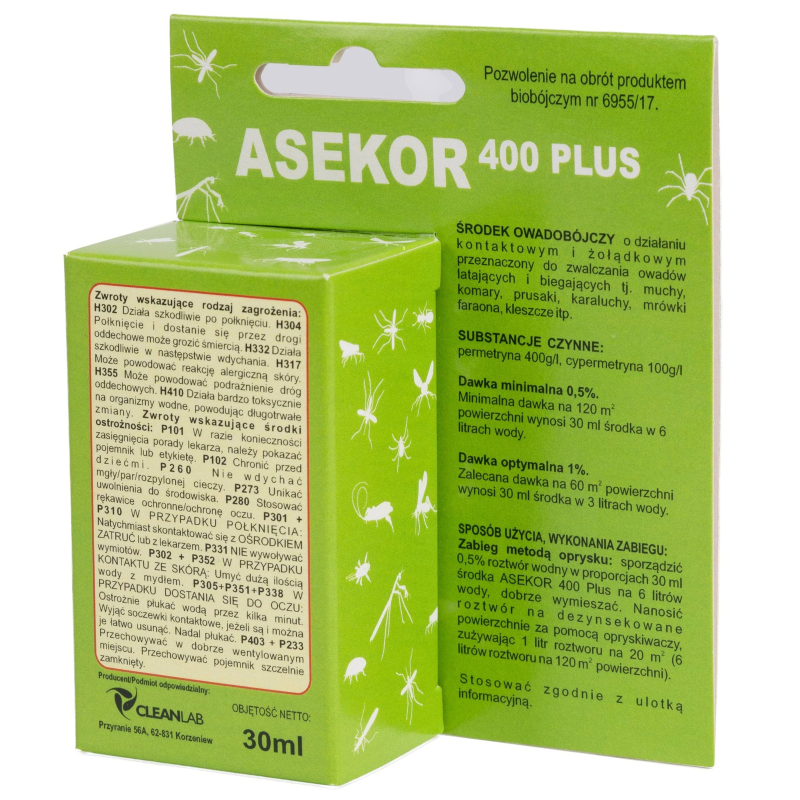 - Środek owadobójczy ASEKOR 400 Plus, 30 ml. Skutecznie eliminuje owady, idealny do stosowania w pomieszczeniach. Szybkie działanie, mała pojemność, wygodny w użyciu.