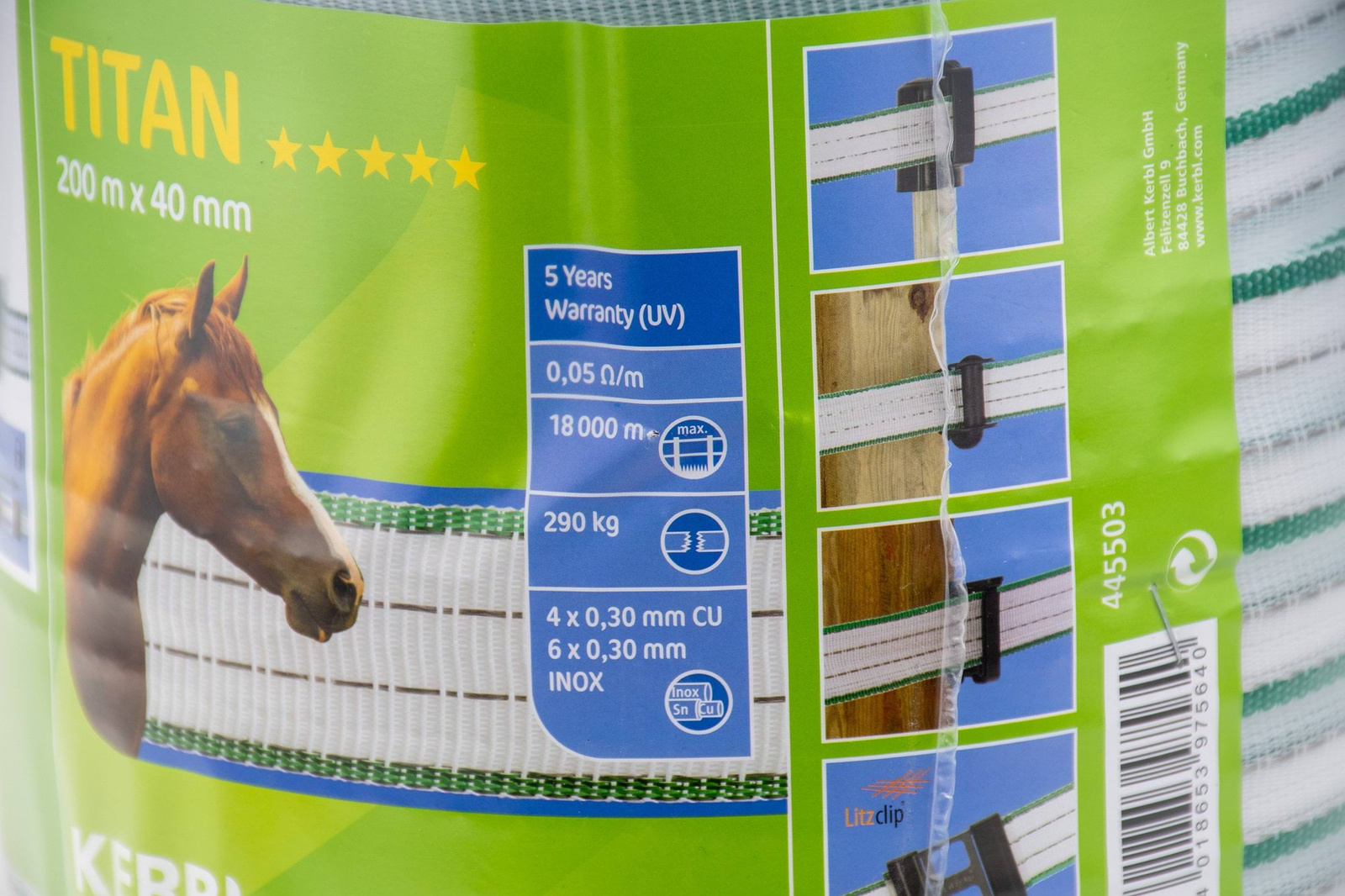 - Taśma ogrodzeniowa TITAN, 200m x 40mm, biało-zielona, Kerbl. Wytrzymała i odporna na warunki atmosferyczne taśma, idealna do ogrodzeń elektrycznych. Zapewnia skuteczne ogrodzenie i łatwy montaż.