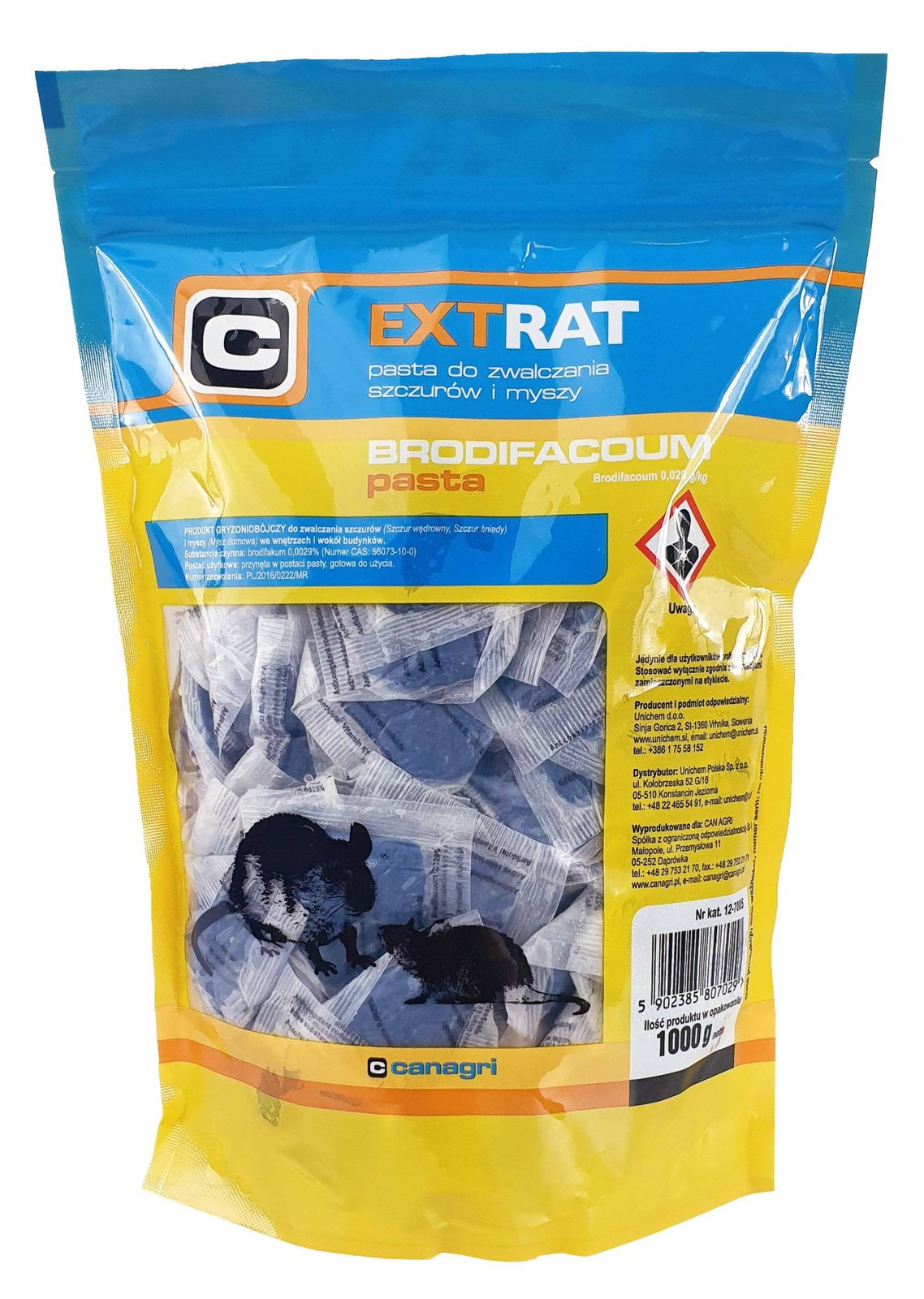 - Trutka na myszy i szczury Extrat, pasta 1 kg, z brodifakum. Skuteczna i atrakcyjna dla gryzoni, zapewnia wysoką efektywność zwalczania szkodników. Idealna do użytku w budynkach gospodarczych i magazynach.