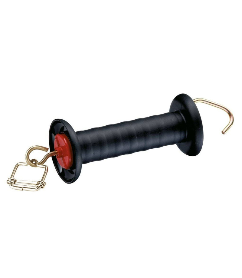 - Uchwyt bramowy z hakiem i ogranicznikiem naciągu, czarny, Kerbl – solidna złączka do taśmy ogrodzeniowej, zapewnia trwałe i bezpieczne zamknięcie pastucha elektrycznego.