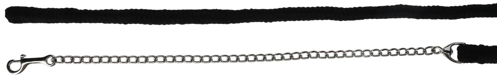 - Bawełniany uwiąz Covalliero z łańcuchem, 200 cm, czarny. Solidny i komfortowy w użyciu, idealny do prowadzenia koni wymagających większej kontroli.